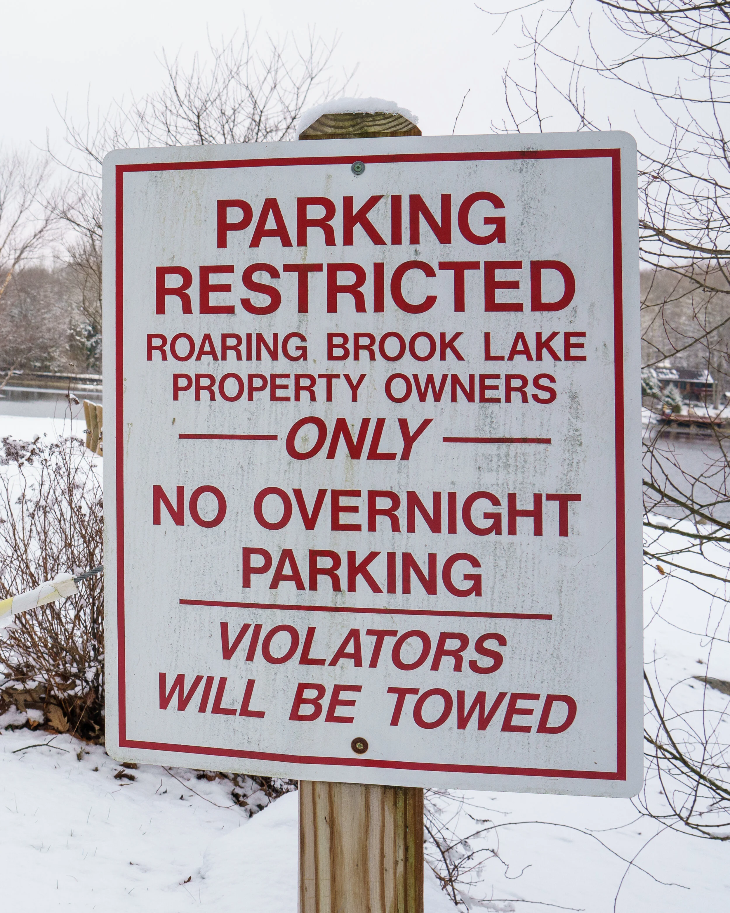 § 100-23A Parking: Roaring Brook Lake District-owned parking areas shall be restricted to property owners, their lessees, the members of their immediate families, and their guests. Any vehicle parked in a Roaring Brook Lake District-owned parking lot shall be identified by displaying a numbered Roaring Brook Lake District registration sticker or tag on its windshield, dashboard, or hanging from the rear-view mirror. Any vehicles not displaying a Roaring Brook Lake District registration sticker or tag may be removed from district parking lots at the owner's expense. No vehicle shall be parked overnight in a RBL District-owned parking lot. (You can see the current section here.)